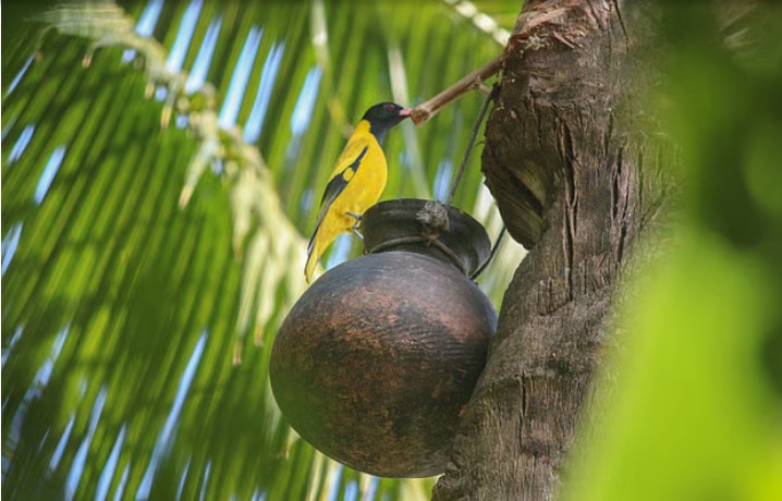 মিষ্টি খেজুর রসের স্বাদ নিতে এসেছে হলদে পাখিটি। রায়েরমহল, খুলনা, ১৭ জানুয়ারি